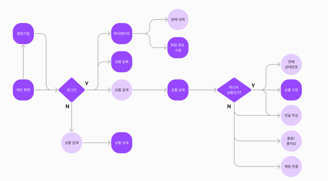간단한 기능들과 검색, 웹 소켓을 활용한 채팅 기능을 사용해 보기 위해 컨셉은 중고 거래 플랫폼으로 선정하여 2명에서 진행을 하기로 해 역할 분담은 하겠지만 대체로 둘 다 모든 기능을 다 다뤄볼 예정이다.