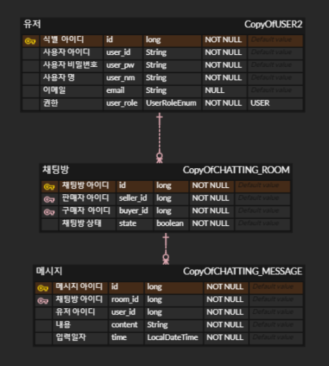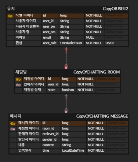 - 유저 - 채팅방 : 1 대 N 관계로 판매자를 대상으로 여러 개의 채팅방을 생성할 예정이다.
