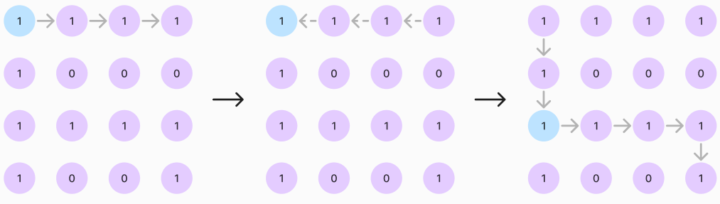 시작 점에서 움직일 수 있는 방향으로 모두 이동하고 해당 점들에서 다시 움직일 수 있는 방향으로 점차 움직인다.