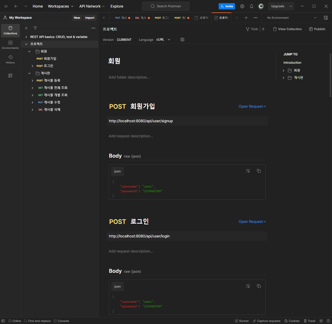 요구사항이 회원가입과 로그인이 추가되었고, 기존에 구현했던 프로젝트에서 게시글 작성, 수정, 삭제에서 토큰 검사 기능이 추가되었다. 페어님과 함께 기능을 분배한 후 같이 코딩을 하면서 계속 서로 물어가면서 기능들을 구현했다. JWT를 이용해서 처음 추가를 하는 부분에 있어서 조금 오류들이 있어 수정하는데 시간이 조금 걸렸다. 기존에 있는 부분에서 가져와서 적용을 하는데도 작동이 잘 안 하는 부분들이 있어 새로 구현하면서 진행을 했다. 생각보다 회원가입과 로그인을 추가하는 부분에 있어서는 기능 구현은 생각보다 쉽게 되었는데 ResponseEntity를 이용하여 상태메시지를 보내는 부분이 오히려 많이 걸렸던 거 같다. 처음에는 제이슨형태를 넣어보려고 했는데 변환하는 과정에서 오류가 계속 나서 문자열로 수정했다가 결국에는 맵을 사용 해서 메시지를 넘기는 걸로 확정을 하고 구현을 하였다. 제이슨을 사용할 때 추가적으로 사용하는 라이브러리들에 관해서 찾아봐 사용법을 알아봐야겠다.